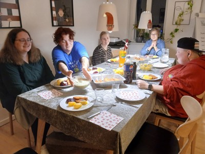 Efter stemmeafgivelsen hentede man valgflæsk, mens kartoflerne kom fra det socioøkologiske landbrug Hanstedholm, hvor flere af dem er i støttebeskæftigelse. Hjemme i fælleslejligheden blev der med fælles hjælp dækket bord, skrællet mange kartofler, sat valg-tv på og delt oplevelser over maden.